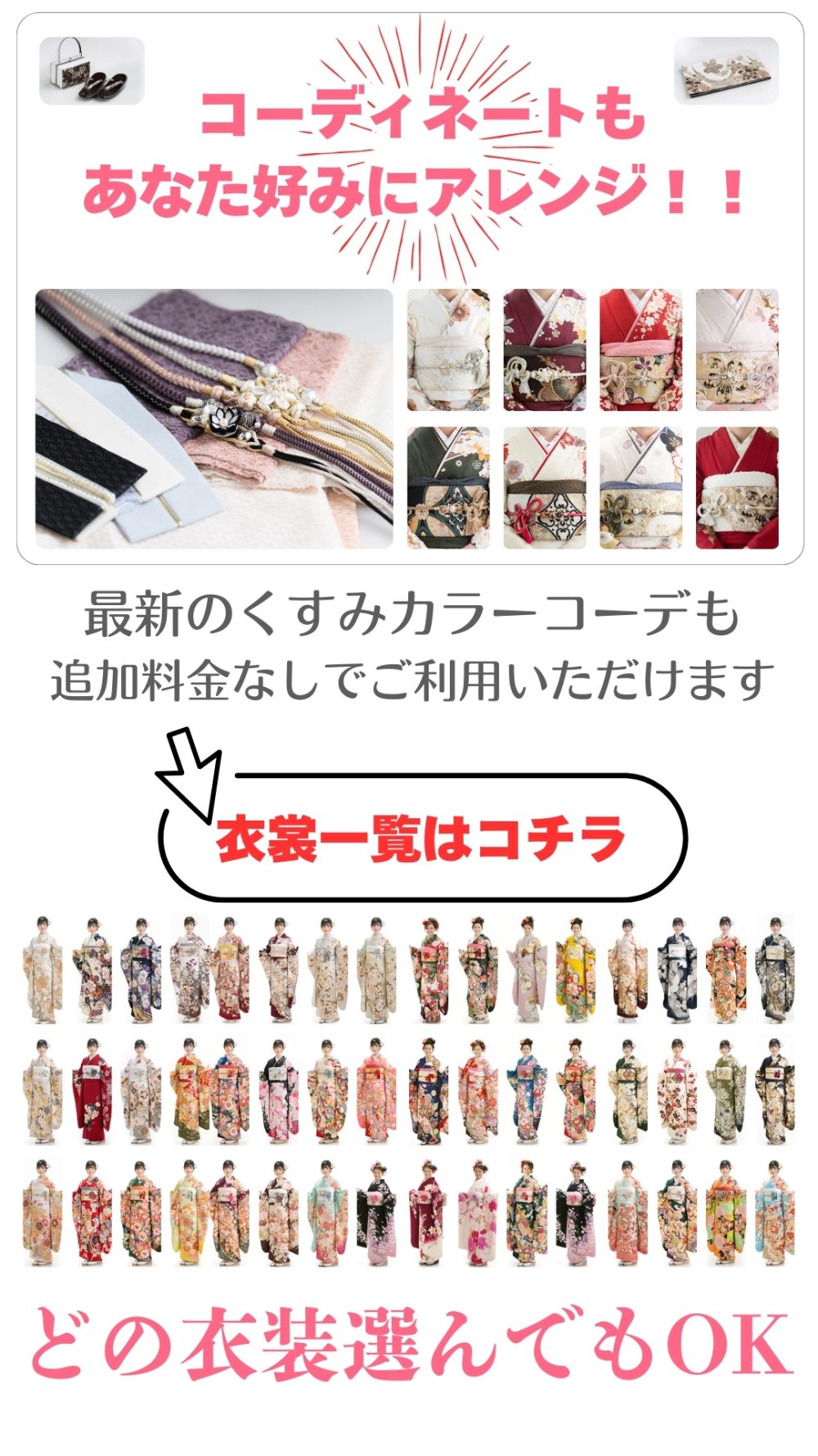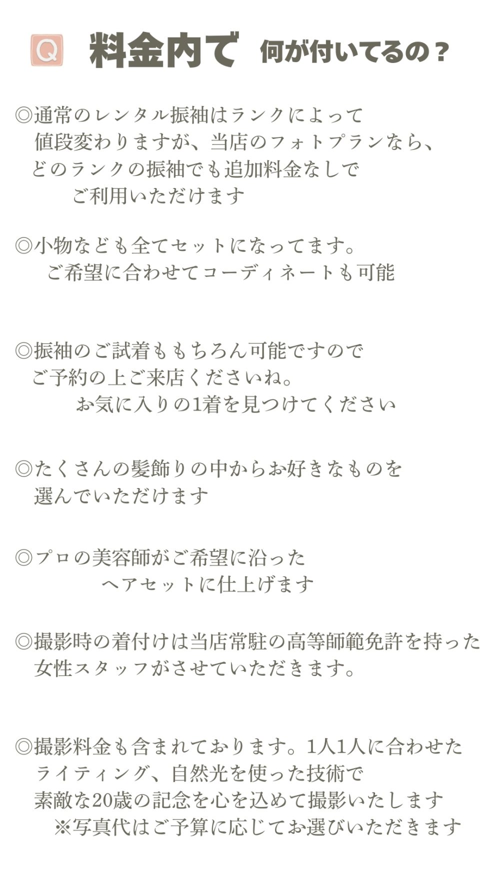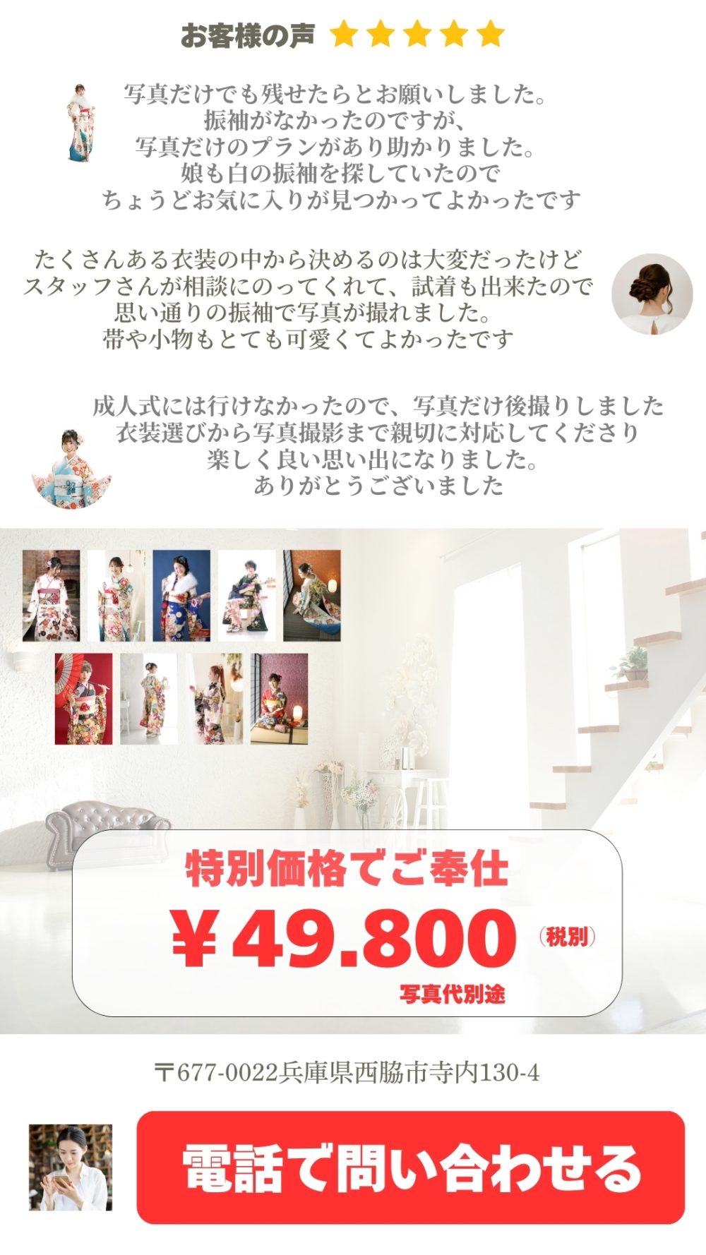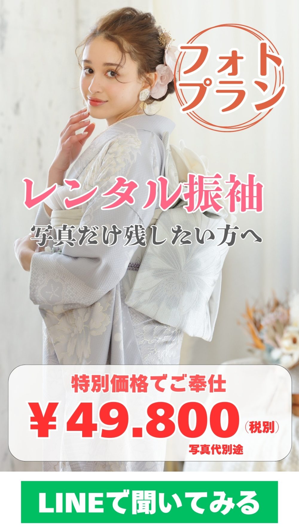 開催中 レンタル振袖フォトプラン 全ランクの中から選んでいただけます レンタル振袖で写真だけ残されたい方へ 当店のレンタル振袖で撮影 全ランクの振袖どれでも選んでいただけます! 試着も可能(ご予約の上ご来店ください) メイク&写真代別途 価格 振袖レンタル 撮影時ヘアセット&着付け 撮影料金 49.800円 写真代金 成人ページに掲載中