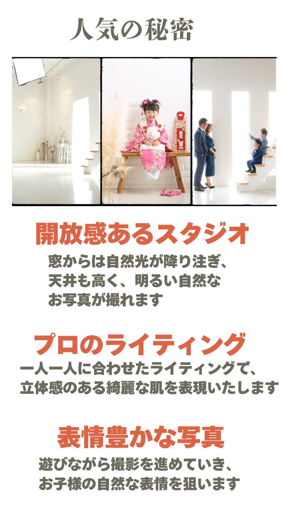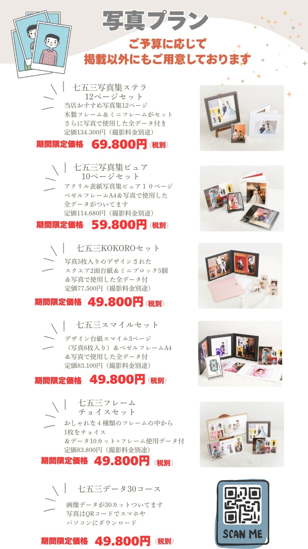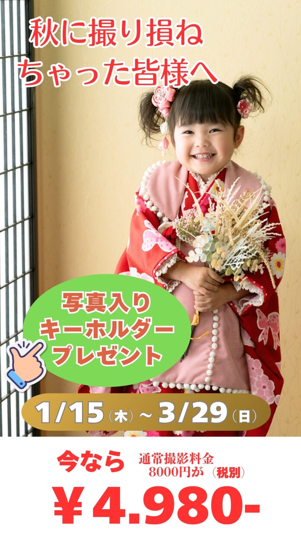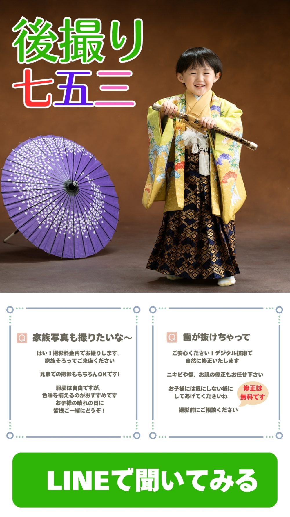 開催予定 七五三 秋に撮り損ねちゃった皆様に!!1/15~3/29までのキャンペーンをご用意 後撮りでゆっくり撮影!笑顔も自然だね。 特徴 写真代金は七五三ページのフォトグッズ欄をご覧くださいね(詳しくはお問合せくださいね) 可愛い衣装がたくさん。 遊びながら撮影するから表情も自然 撮ったお写真見本(当店透かしロゴ入り)はLINEにて送信します!家でゆっくり選んでね。 七五三料金(税別) 撮影料金 後撮りキャンペーン価格(1月~3月)通常8.000円 4.980円 写真料金 七五三ページに掲載 七五三ページはこちら