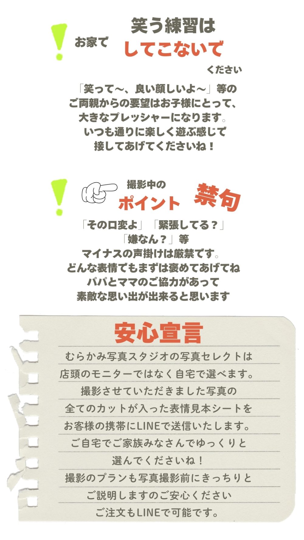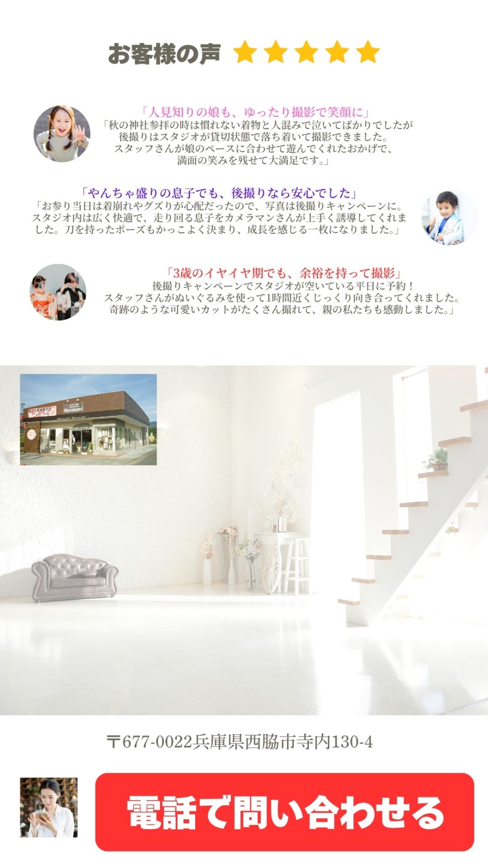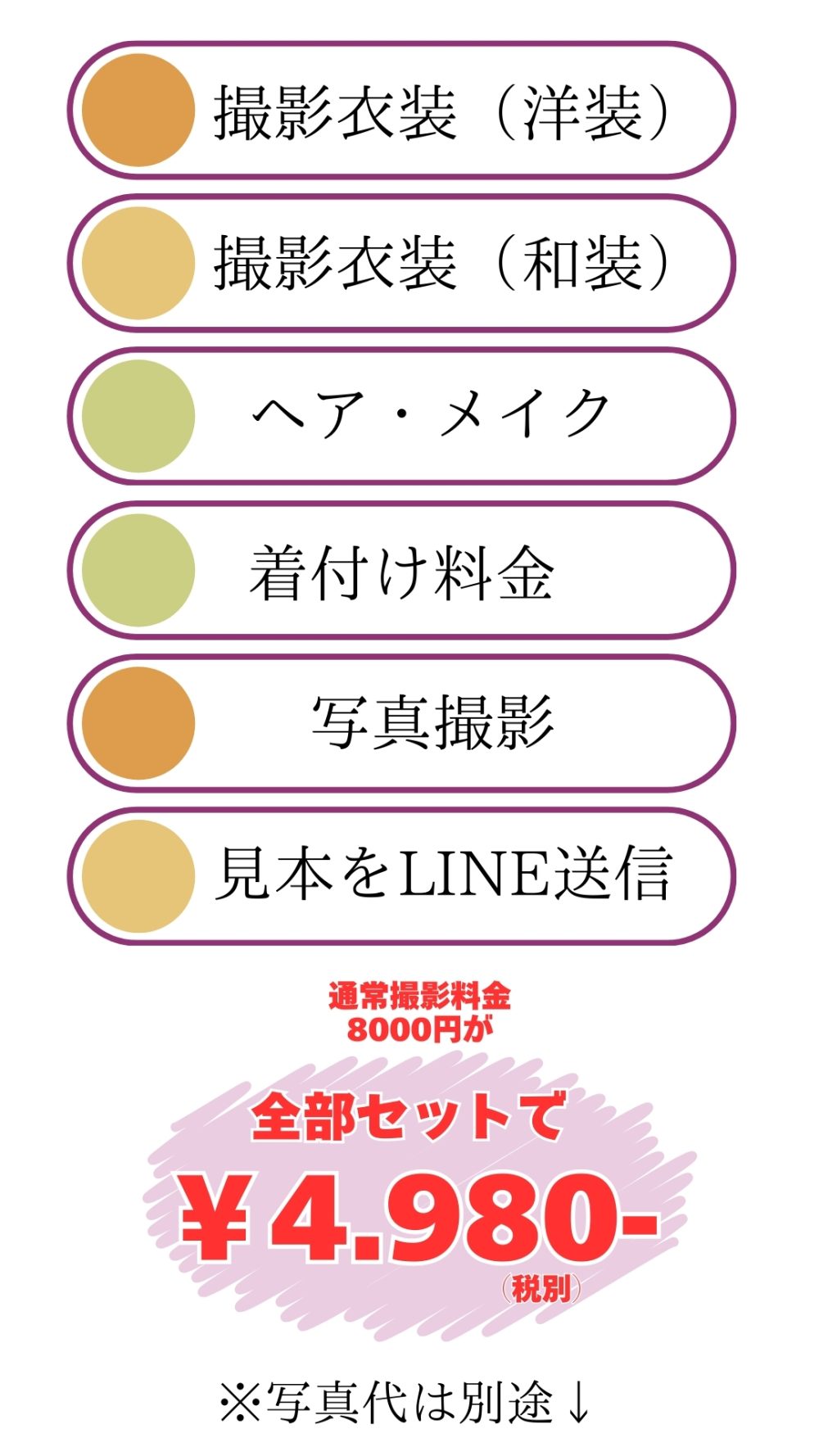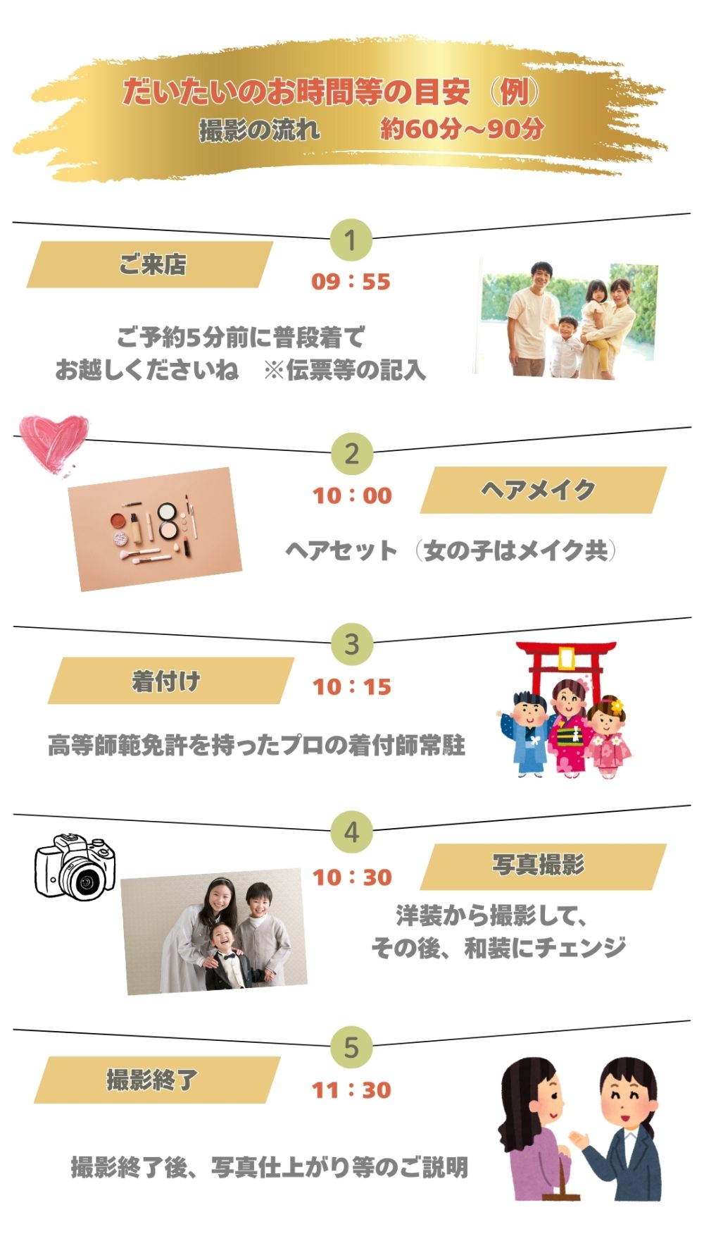 開催予定 七五三 秋に撮り損ねちゃった皆様に!!1/15~3/29までのキャンペーンをご用意 後撮りでゆっくり撮影!笑顔も自然だね。 特徴 写真代金は七五三ページのフォトグッズ欄をご覧くださいね(詳しくはお問合せくださいね) 可愛い衣装がたくさん。 遊びながら撮影するから表情も自然 撮ったお写真見本(当店透かしロゴ入り)はLINEにて送信します!家でゆっくり選んでね。 七五三料金(税別) 撮影料金 後撮りキャンペーン価格(1月~3月)通常8.000円 4.980円 写真料金 七五三ページに掲載 七五三ページはこちら