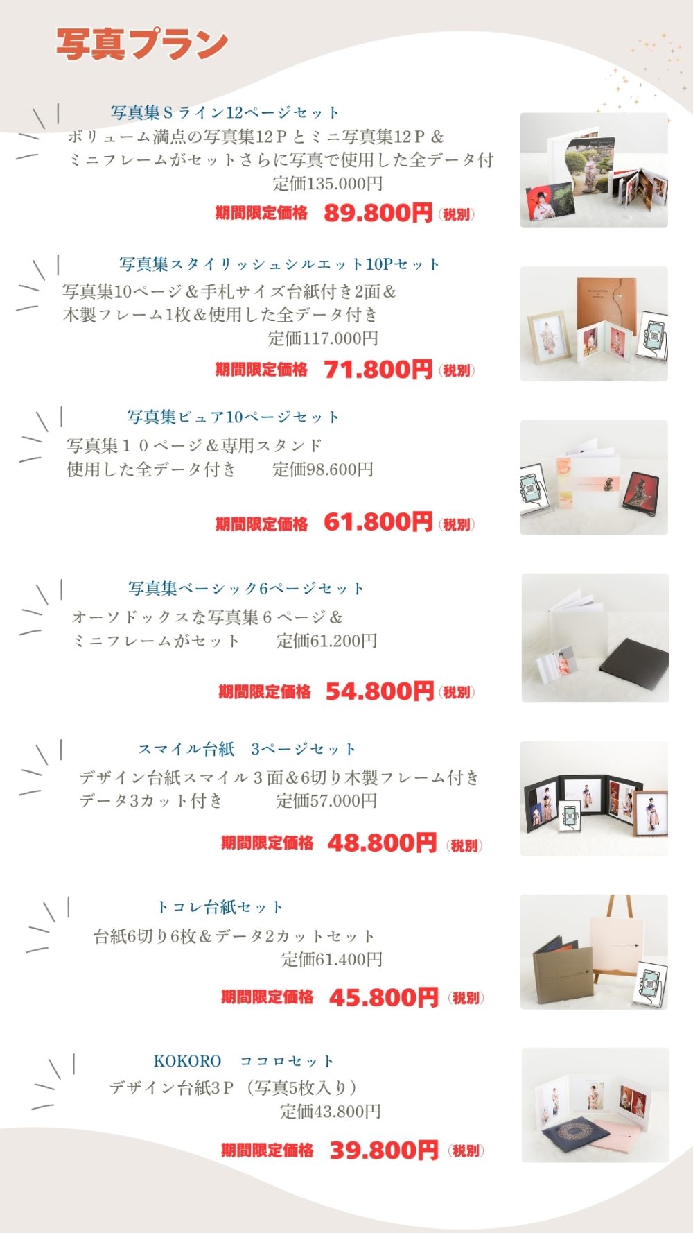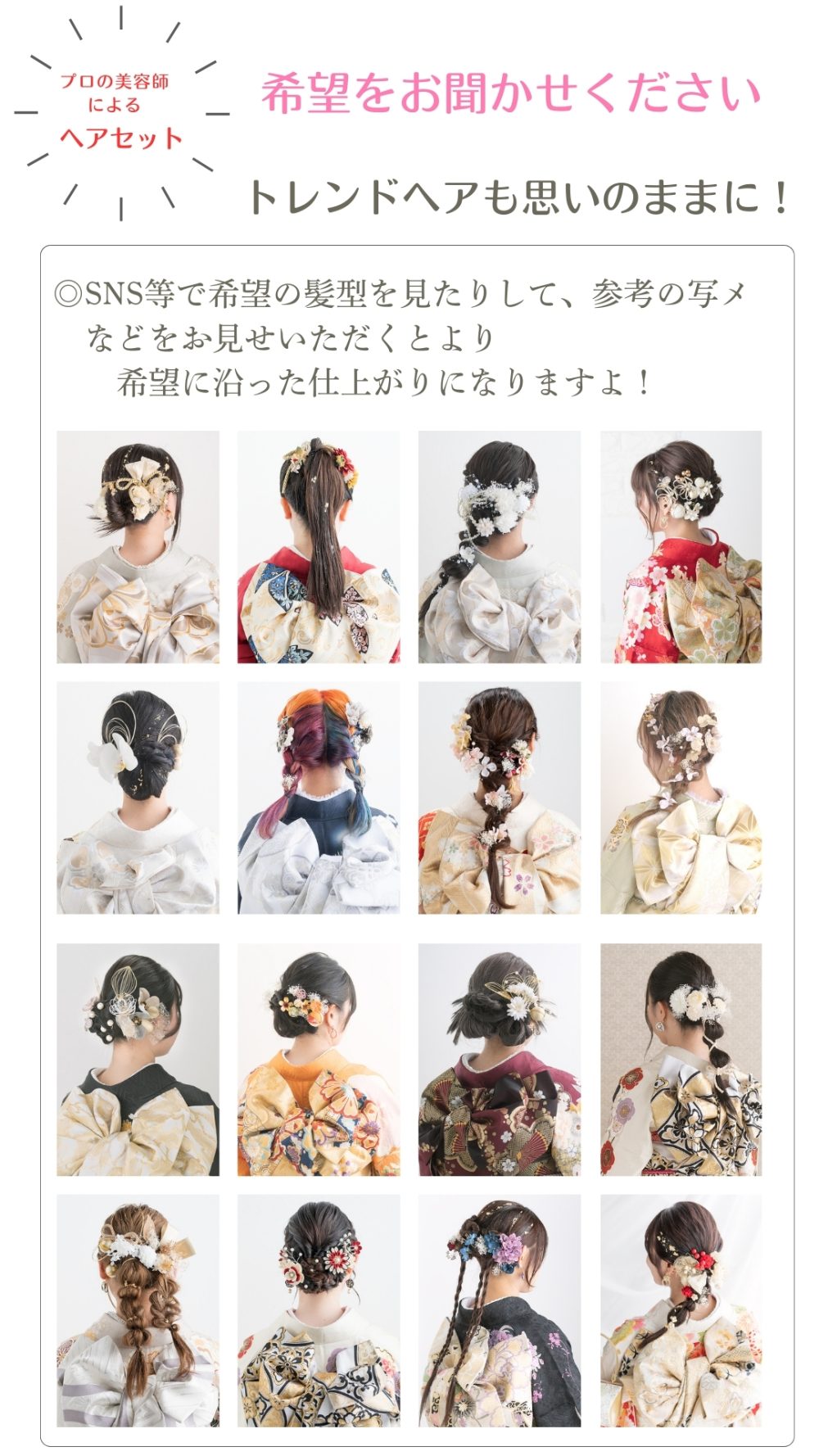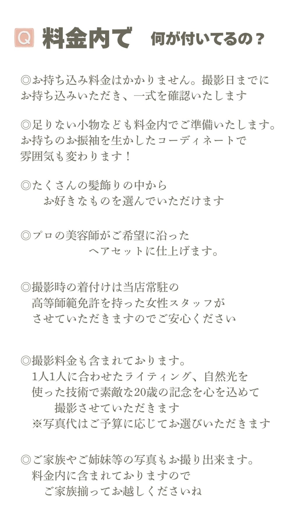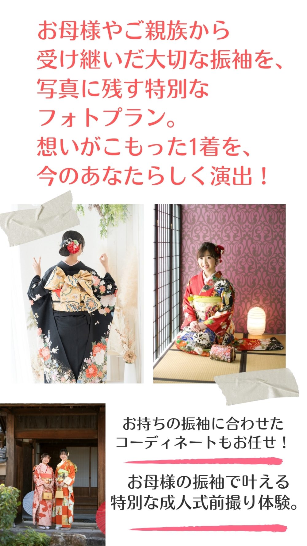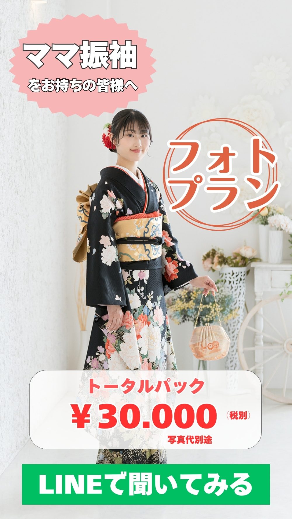 開催中 ママ振袖フォトプランもご用意しております お持ち込みの着物で撮影 お持ちの振袖をお持ちください 足りない小物はコーディネートいたします 撮影時のヘアセット&着付けがついてます 撮影料金込み(写真代別途) 髪飾りも自由にお選びください ママ振袖フォトプラン ヘアセット&着付け&撮影料金(写真代別途) 30.000円
