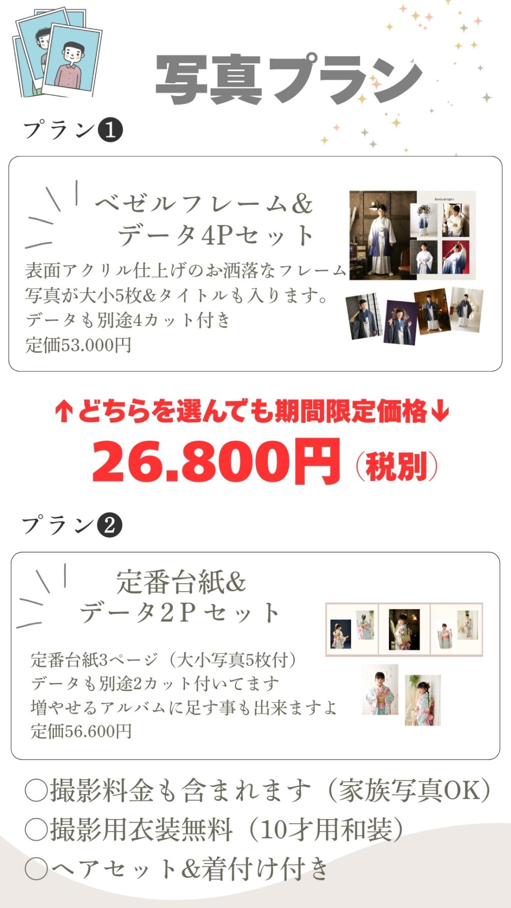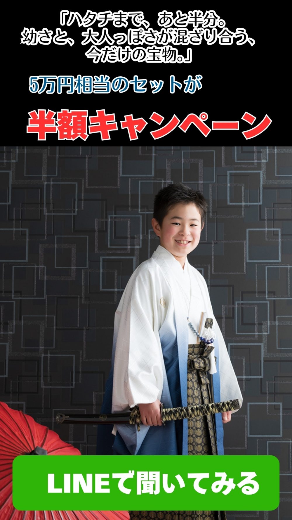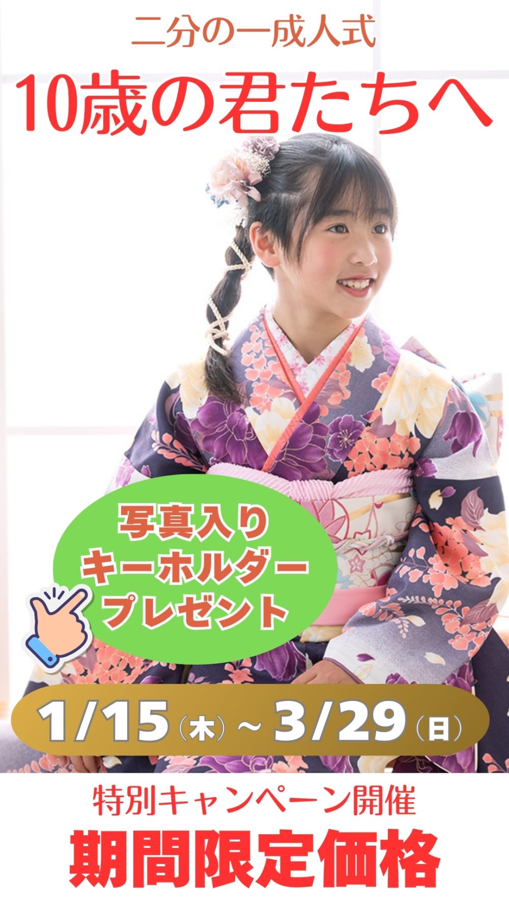 開催予定 二分の一成人式キャンペーン 2026年1月15日~3月29日まで開催予定 20歳の半分! 10歳になるお子様対象のキャンペーン LINEで聞いてみる LINEで聞いてみる 二分の一成人式キャンペーン 男女ともに和装を着て二分の一成人式の撮影です 撮影料金、撮影衣装、ヘアセット、着付けがすべてセットの料金です 写真コースは2パターンからお好きな方をチョイス 料金(税別) 撮影料金+ベゼルフレーム+データ4カット(衣装&ご支度付)定価53.000円 キャンペーン価格 26.800円 撮影料金+写真台紙5枚+データ2カット(衣装&ご支度付)定価56.600円 キャンペーン価格 26.800円