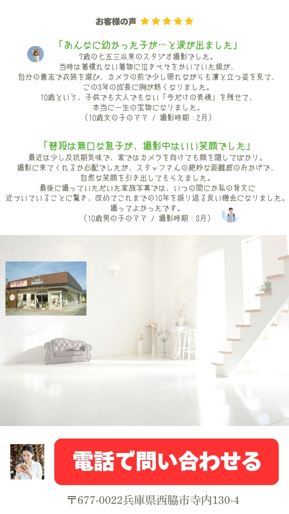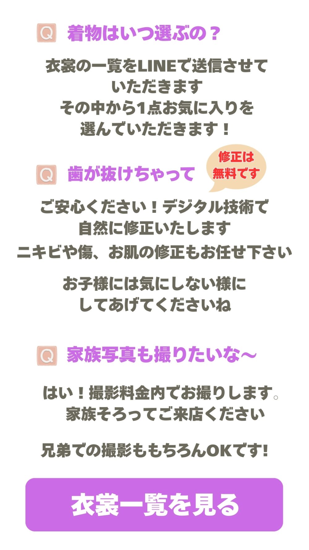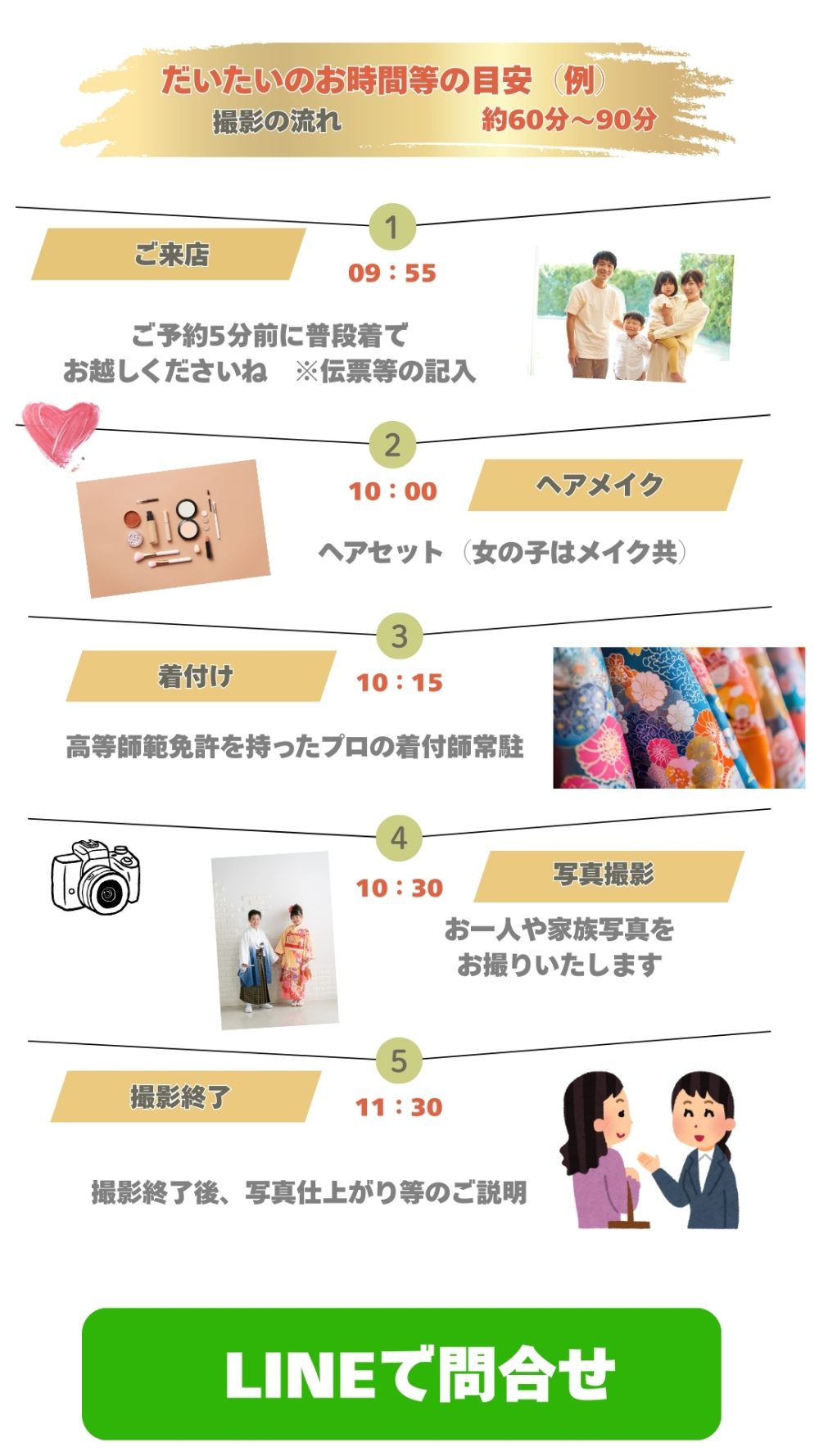開催予定 二分の一成人式キャンペーン 2026年1月15日~3月29日まで開催予定 20歳の半分! 10歳になるお子様対象のキャンペーン LINEで聞いてみる LINEで聞いてみる 二分の一成人式キャンペーン 男女ともに和装を着て二分の一成人式の撮影です 撮影料金、撮影衣装、ヘアセット、着付けがすべてセットの料金です 写真コースは2パターンからお好きな方をチョイス 料金(税別) 撮影料金+ベゼルフレーム+データ4カット(衣装&ご支度付)定価53.000円 キャンペーン価格 26.800円 撮影料金+写真台紙5枚+データ2カット(衣装&ご支度付)定価56.600円 キャンペーン価格 26.800円
