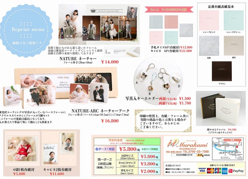 日本の伝統行事の「七五三」。お子様の一大イベントです。 むらかみ写真スタジオでは一生残る大事な写真を、心を込めて撮影いたします。近年、お宮参りに行かなくても写真だけ残す方もいらっしゃいます。